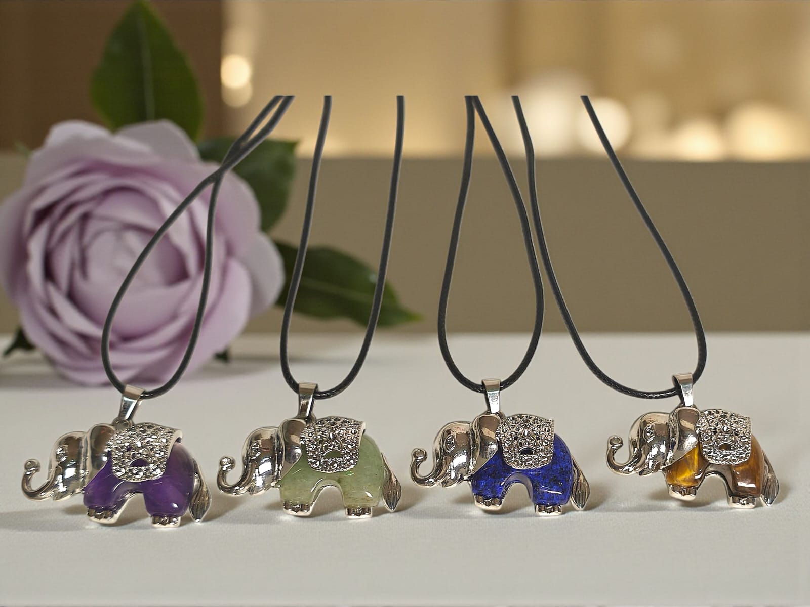 Este delicado colgante en forma de Elefante fusiona belleza, transformación y energía espiritual. Cada diseño está tallado en un tipo distinto de cuarzo o piedra semipreciosa, creando una sinergia única de colores y propiedades: